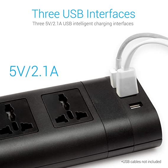 | Special Features | It has fireproof material with 5V/2.1A/3USB intelligent charging interfaces with a cord length of 1.5m. You can connect your monitor, CPU, Speakers, Laptop, Modem, TV, Sound system and many other 5A electric appliances. |