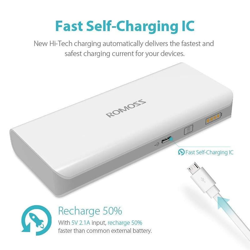 FAST SELF-CHARGING TECHNOLOGY - Automatically adjust the current and voltage, speeding up the charging efficiency up to 90%. With 5V 2.1A input, it can get fully charged in just 6.5 hours, 50% faster than common external battery in 13 -14 hours.