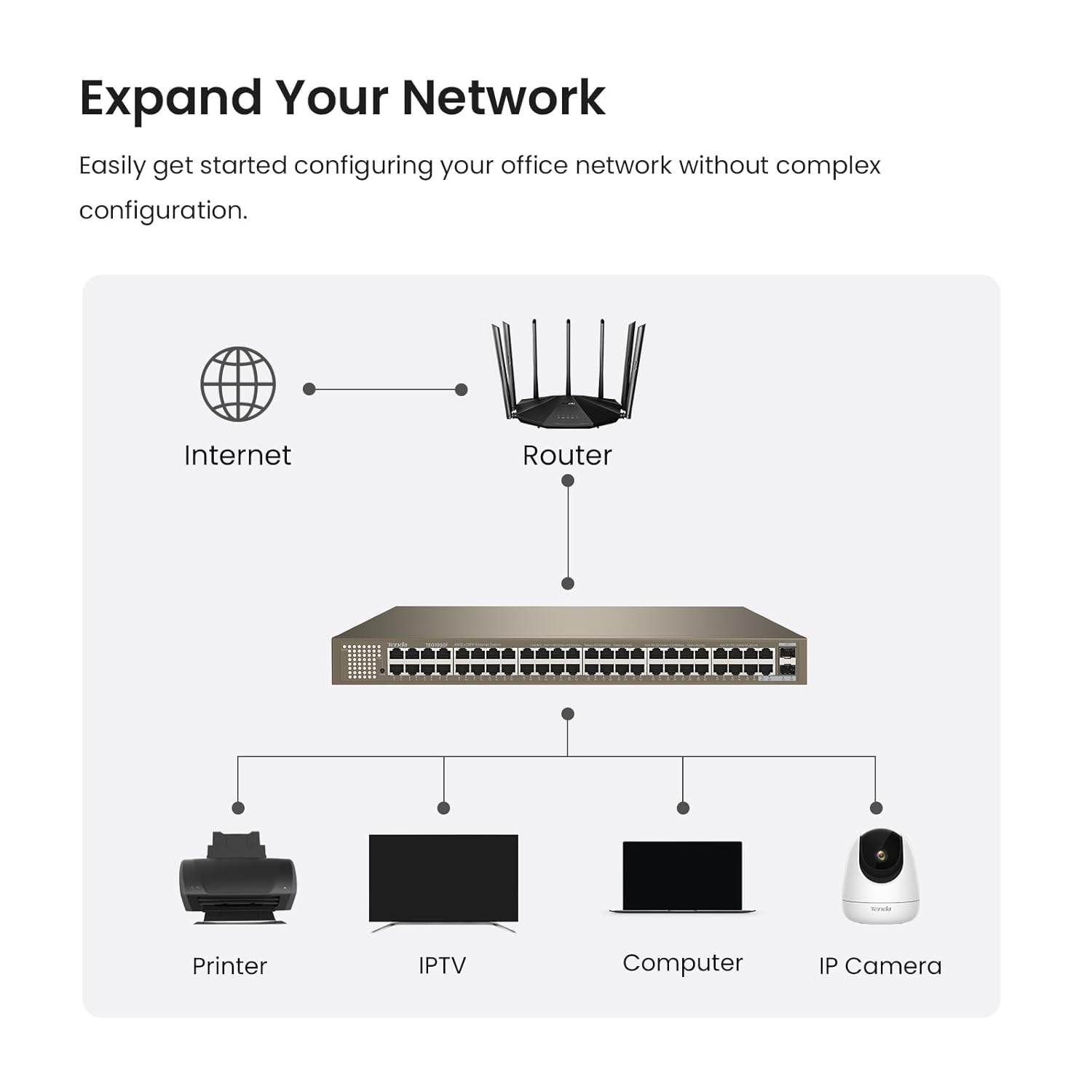 Port Configuration: Equipped with 48 auto-negotiating 10/100/1000 Mbps RJ45 Ethernet ports and 2 Gigabit SFP slots for high-speed, reliable connections.